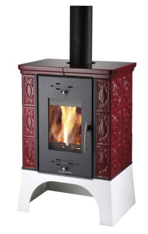 Kachlová kamna Empoli s výměníkem v provedení černý plech a bordo kachle, mají automatický regulátor primárního spalovacího vzduchu