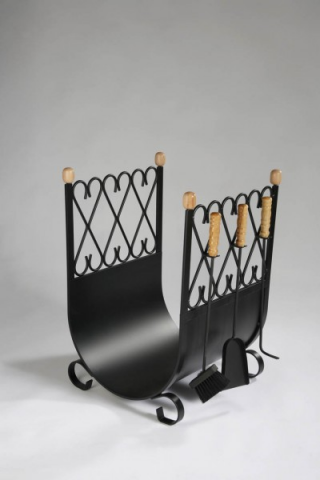 Velký koš na dřevo Haas+Sohn v provedení černý plech s třemi kousky nářadí s dřevěnou rukojetí.